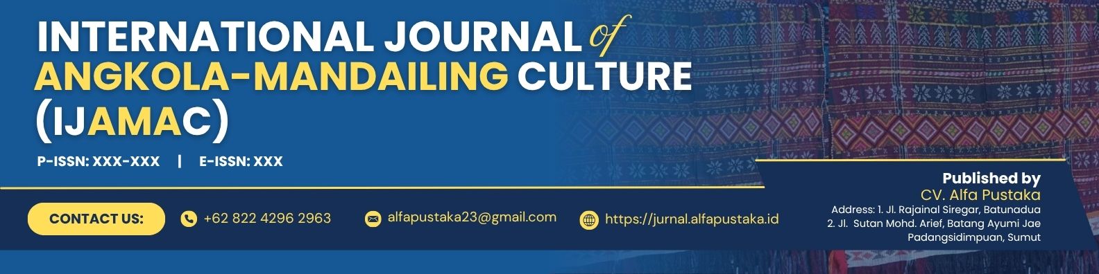 International Journal of Angkola-Mandailing Culture (IJAMAC) is an open-access journal that aims to preserve and disseminate research related to Angkola-Mandailing culture, particularly in the Angkola-Mandailing area. The topic may range from cultural concerns to everyday issues, offering a real contribution to the local community.